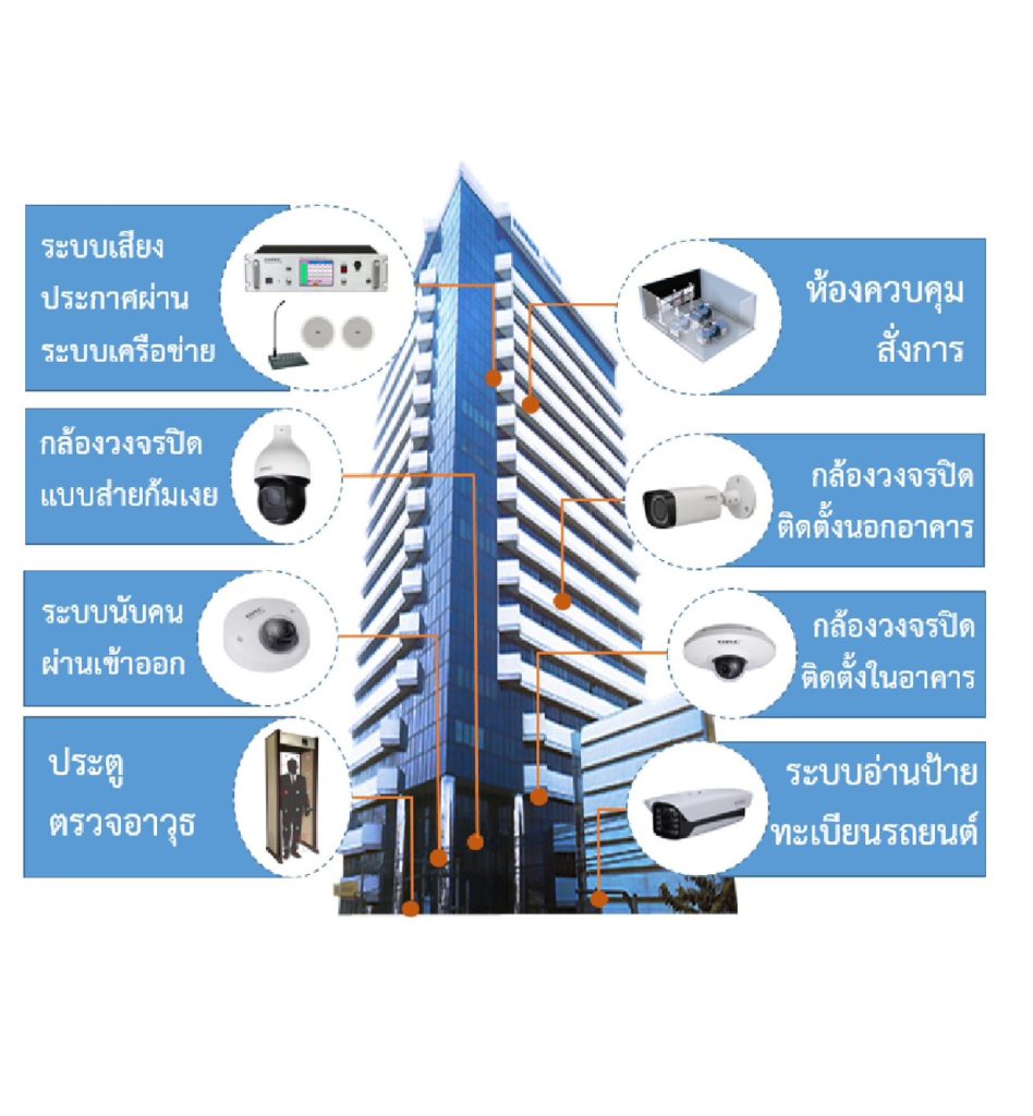 ระบบกล้องวงจรปิด มีการผสมผสานกล้องวงจรปิดหลายชนิด เพื่อความเหมาะสมกับสภาพการตกแต่งในอาคาร และมีระบบซอฟต์แวร์ต่างๆ อาทิ ระบบอ่านป้ายทะเบียน ระบบนับจำนวนคน ระบบจดจำใบหน้า รวมทั้งอุปกรณ์ตรวจอาวุธ ทั้งชนิดมือถือ และประตูตรวจอาวุธเพื่อควบคุมการผ่านเข้าออกอาคาร